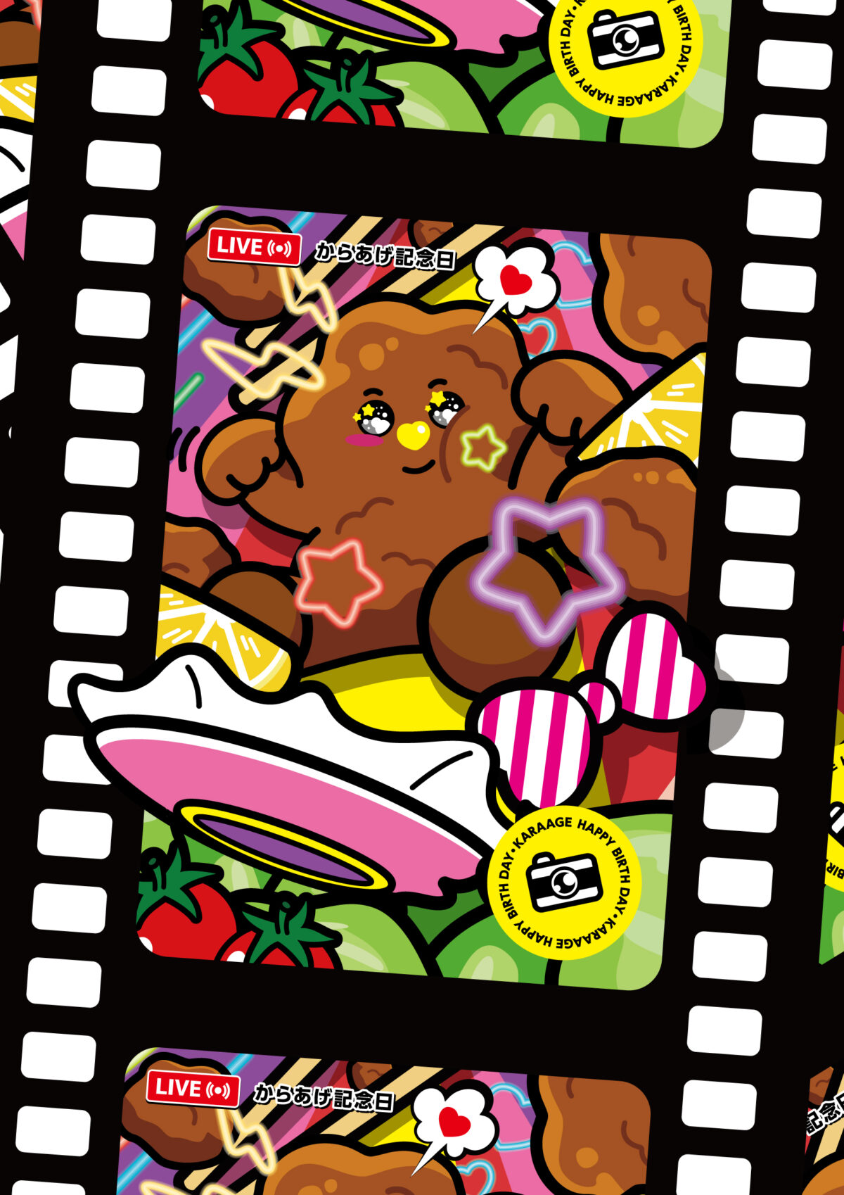 この作品は、あの日のワクワクと母の愛を「からあげキャラクター」として描き、映画のフィルム風に「記憶の一コマ」として表現しました。