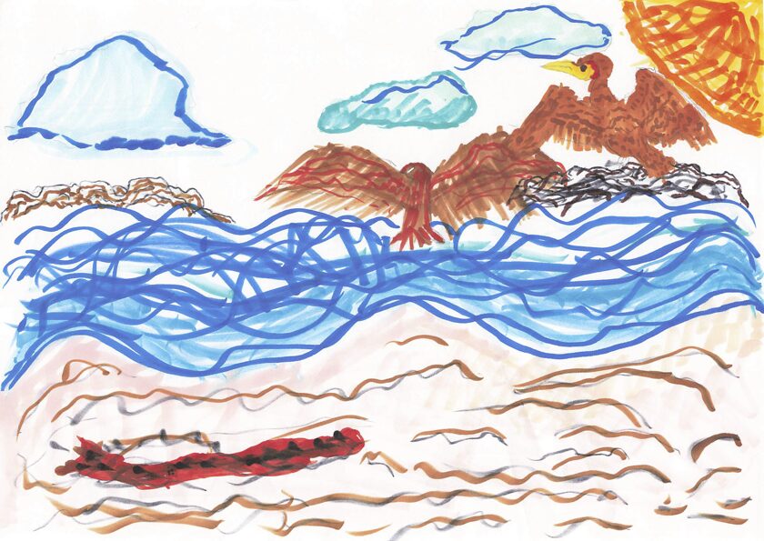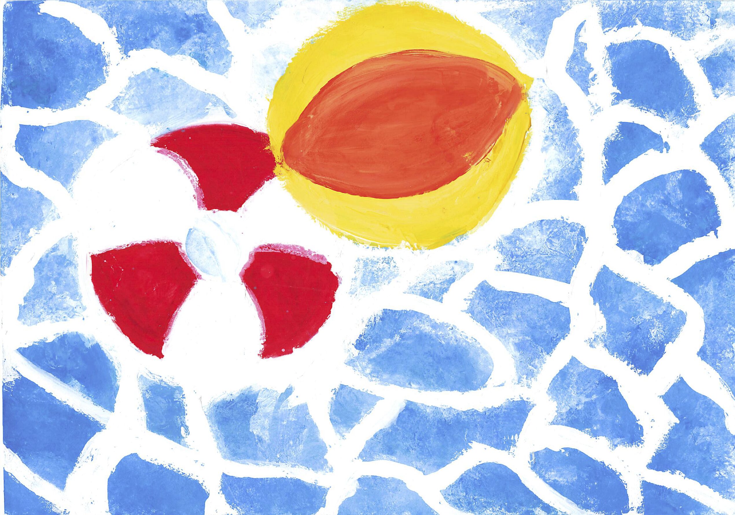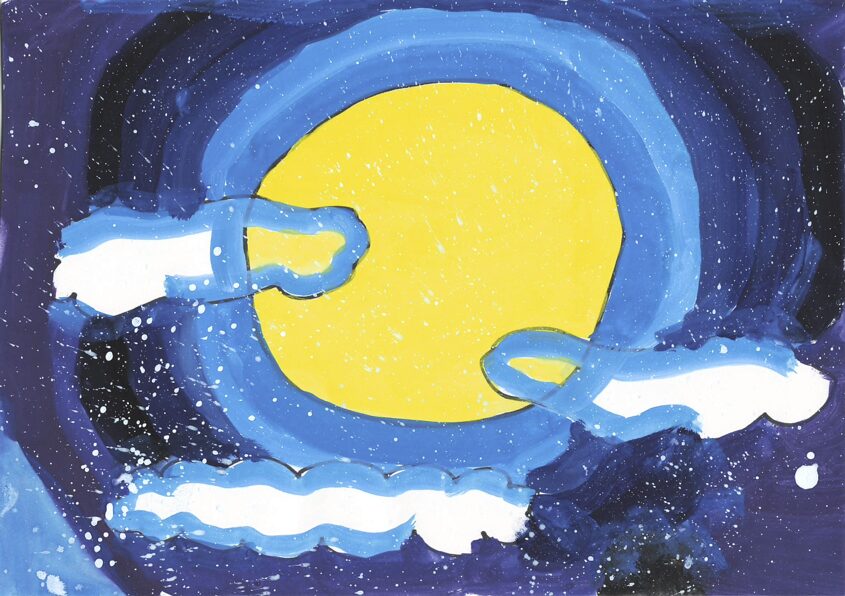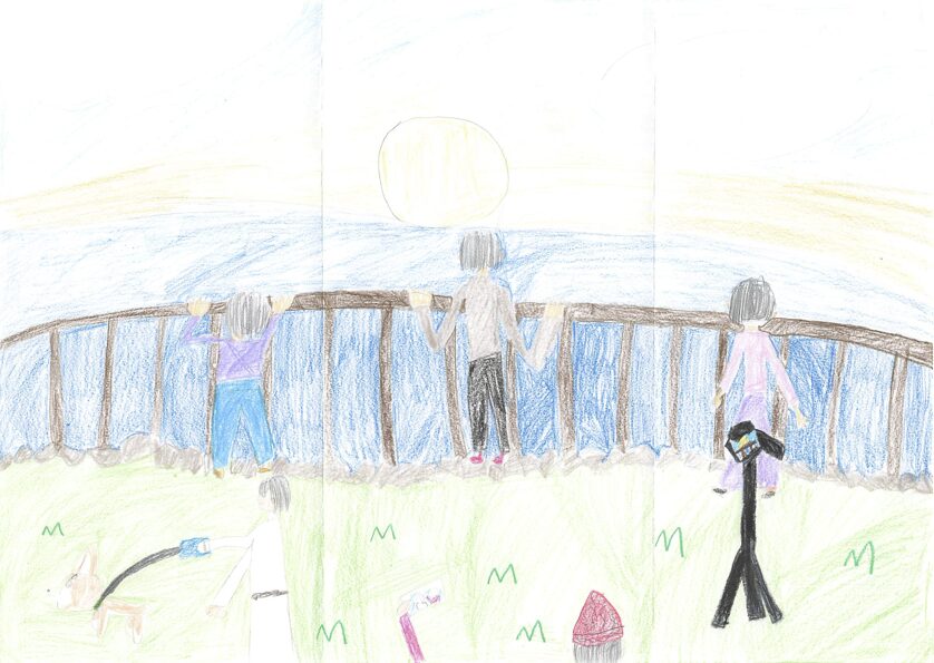 私は初日の出を見るのが好きで、初日の出を見る行事があったので、こういうきかいがあって描きました。私は海の色をグラデーションのようにして描きました。次にこういうきかいがあったら、花火の絵を描きたいです。