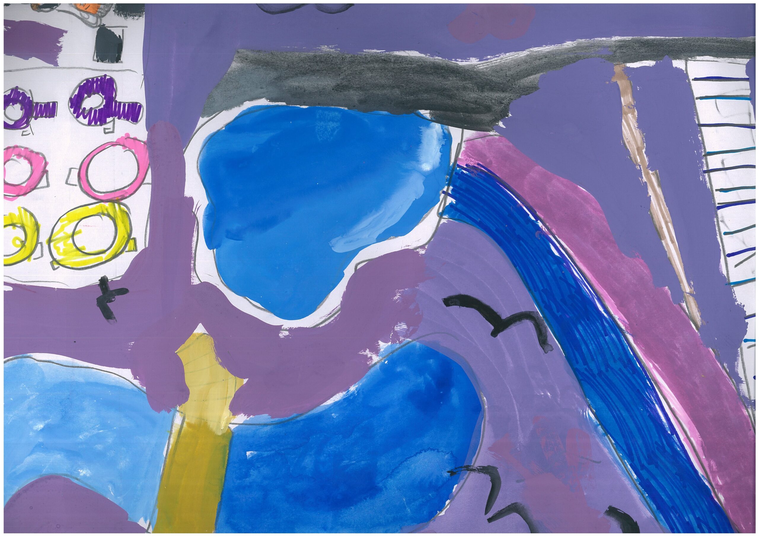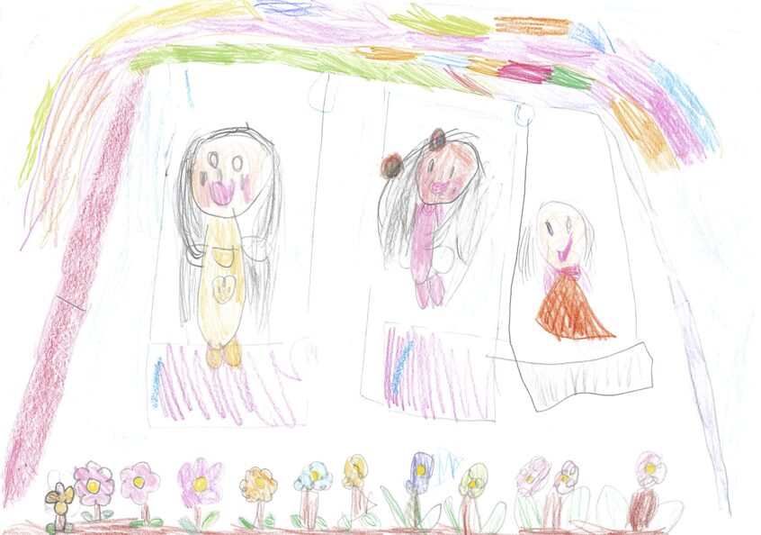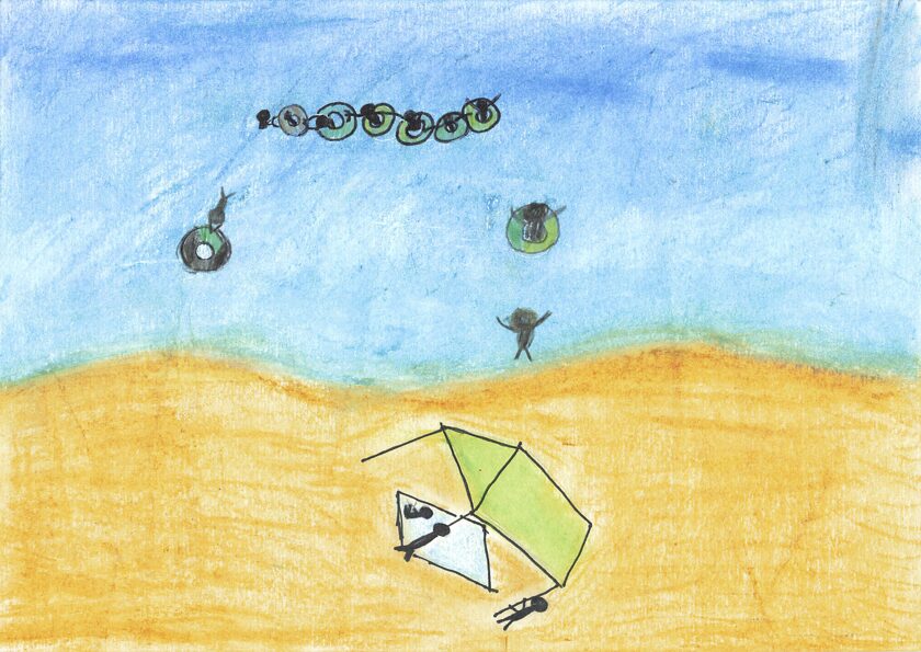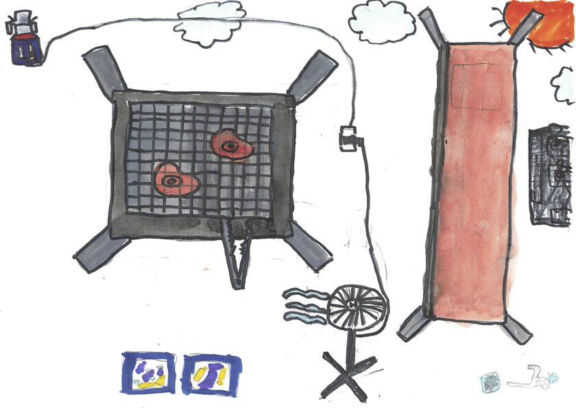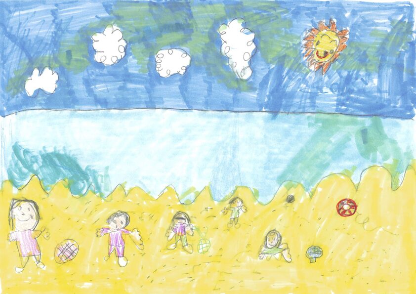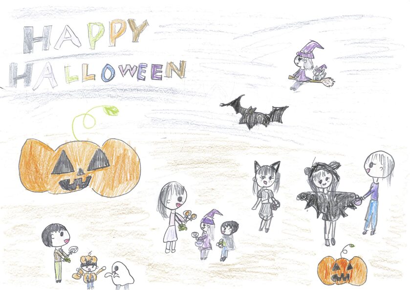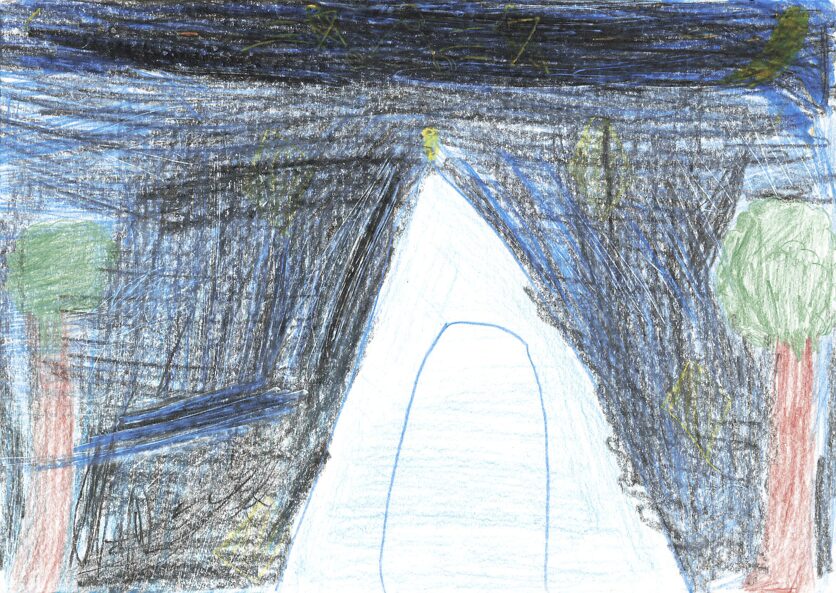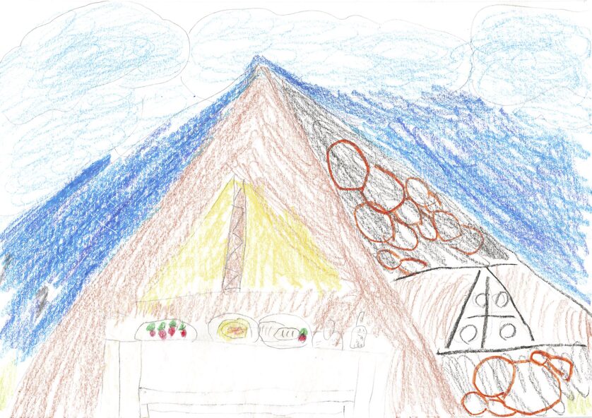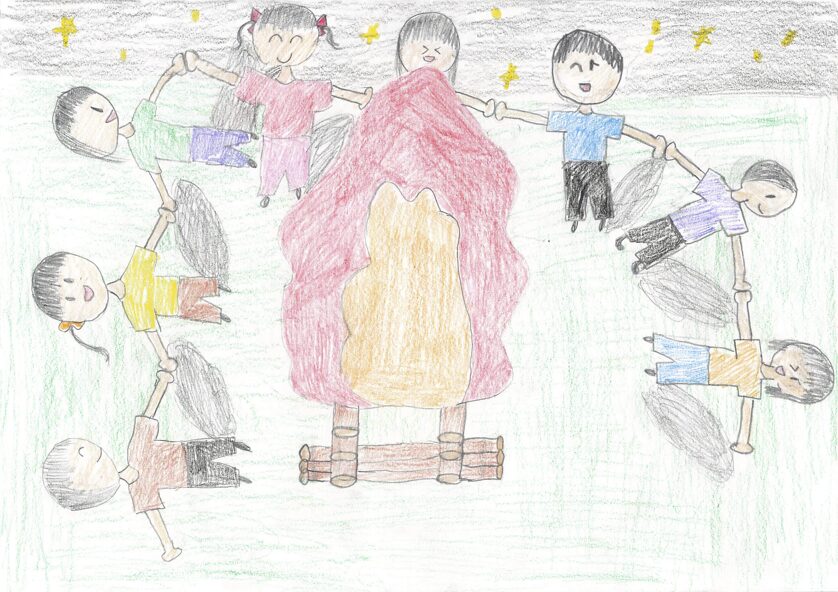 これは子どもの園のみんなで行ったキャンプの時のキャンプファイヤーの絵です。子どもの園では毎年5日間山梨県にキャンプに行きます。テントで寝たり、森でまきを拾って火をたいて、ごはんを作ったりします。登山をしたり牧場でじゃがいもほりをしたりして、とても楽しかったです。最後の夜にしたキャンプファイヤーが一番楽しくて心に残ったので、この絵を描きました。
