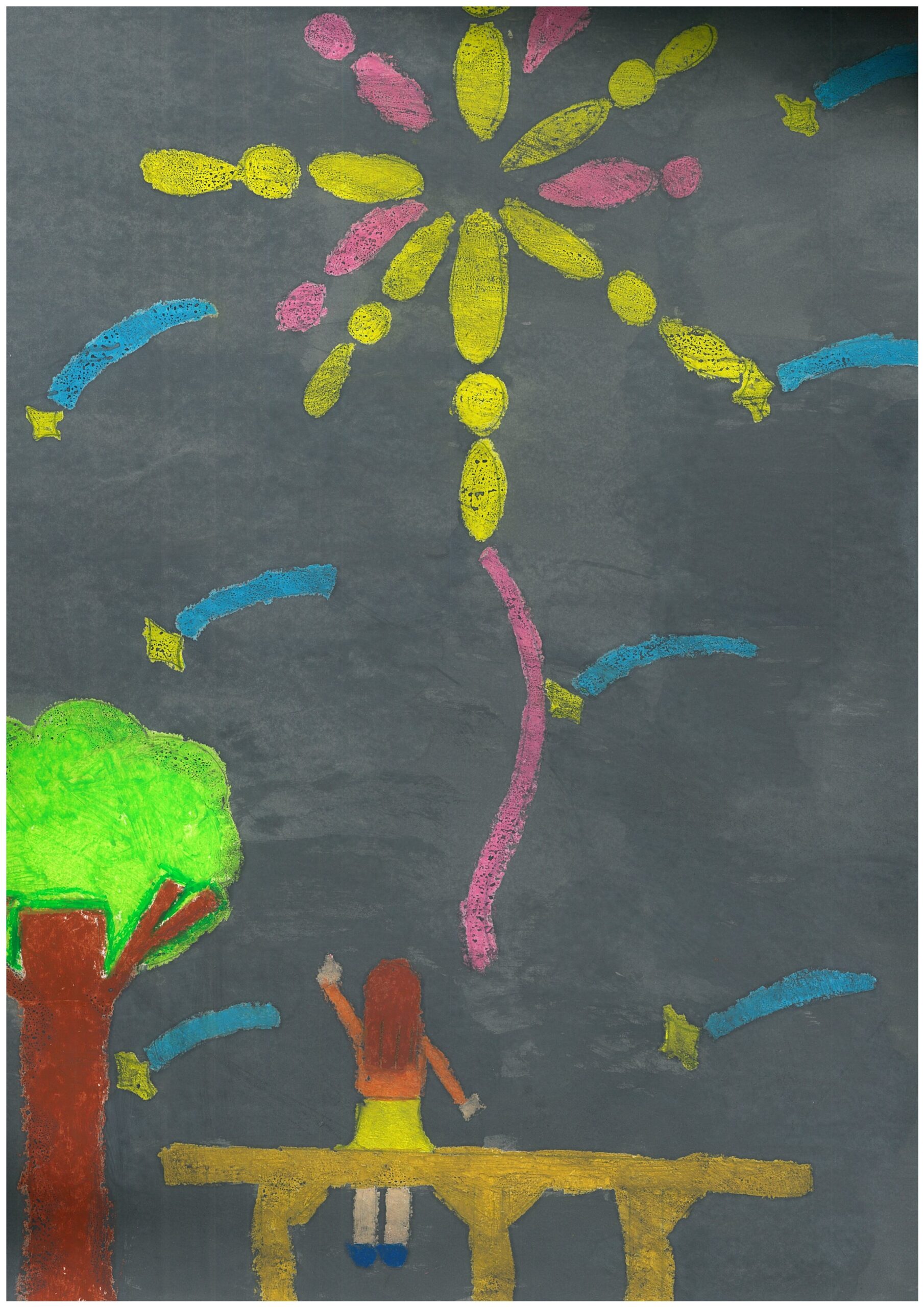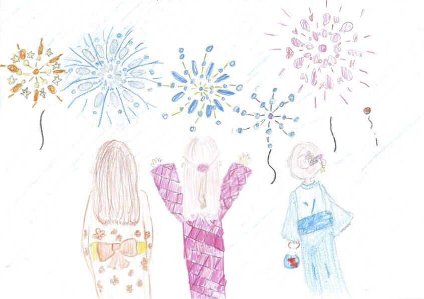 目に焼き付いた花火と喜ぶ姿を大胆な構図で描いており、とても印象的です。