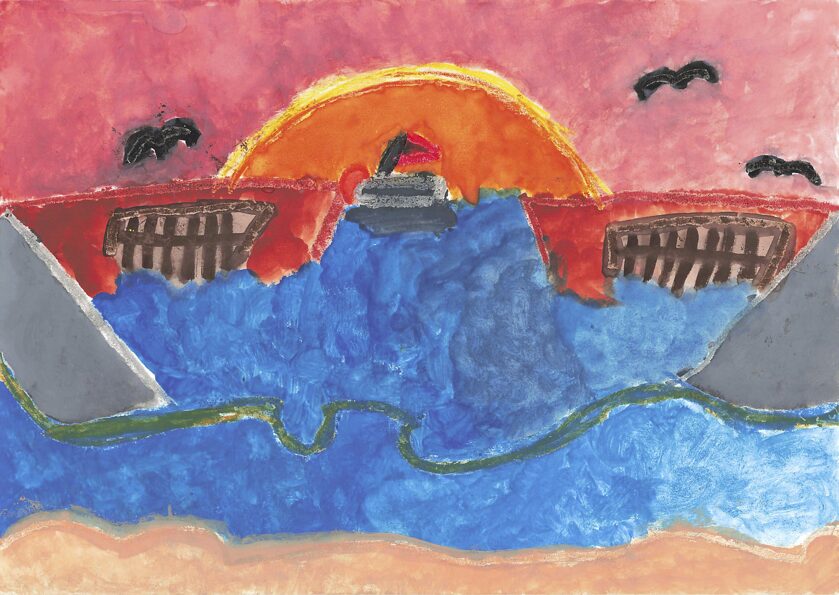 夕陽の映り込みも本物の夕陽と離して描いていて青みがかっていてとてもよく描けています。